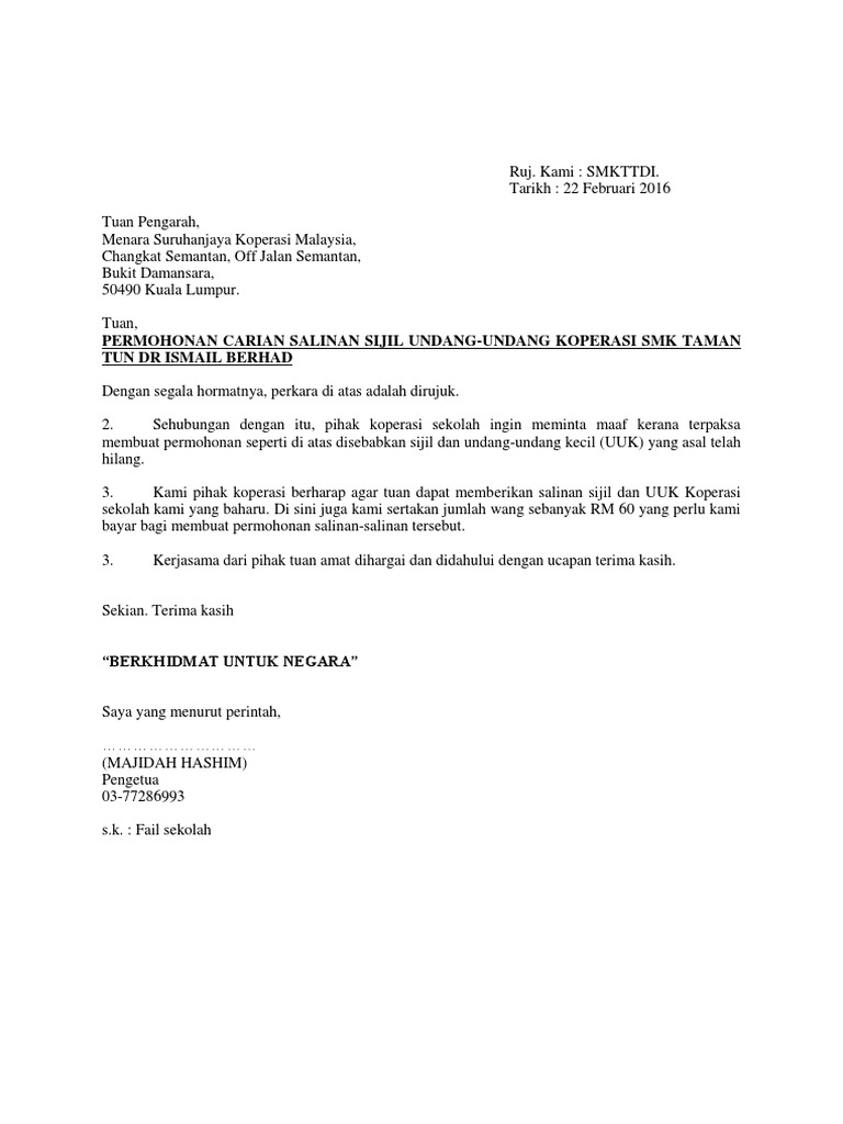 Surat Permohonan Salinan Sijil Koperasi Ke Skm Pdf